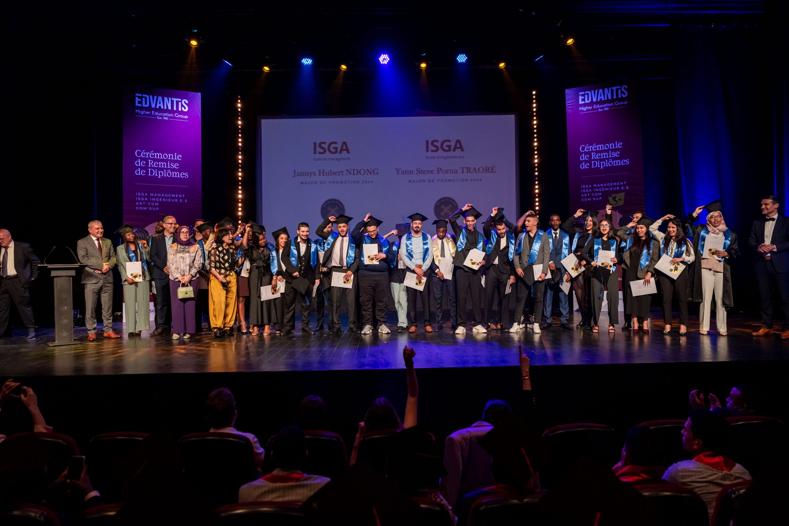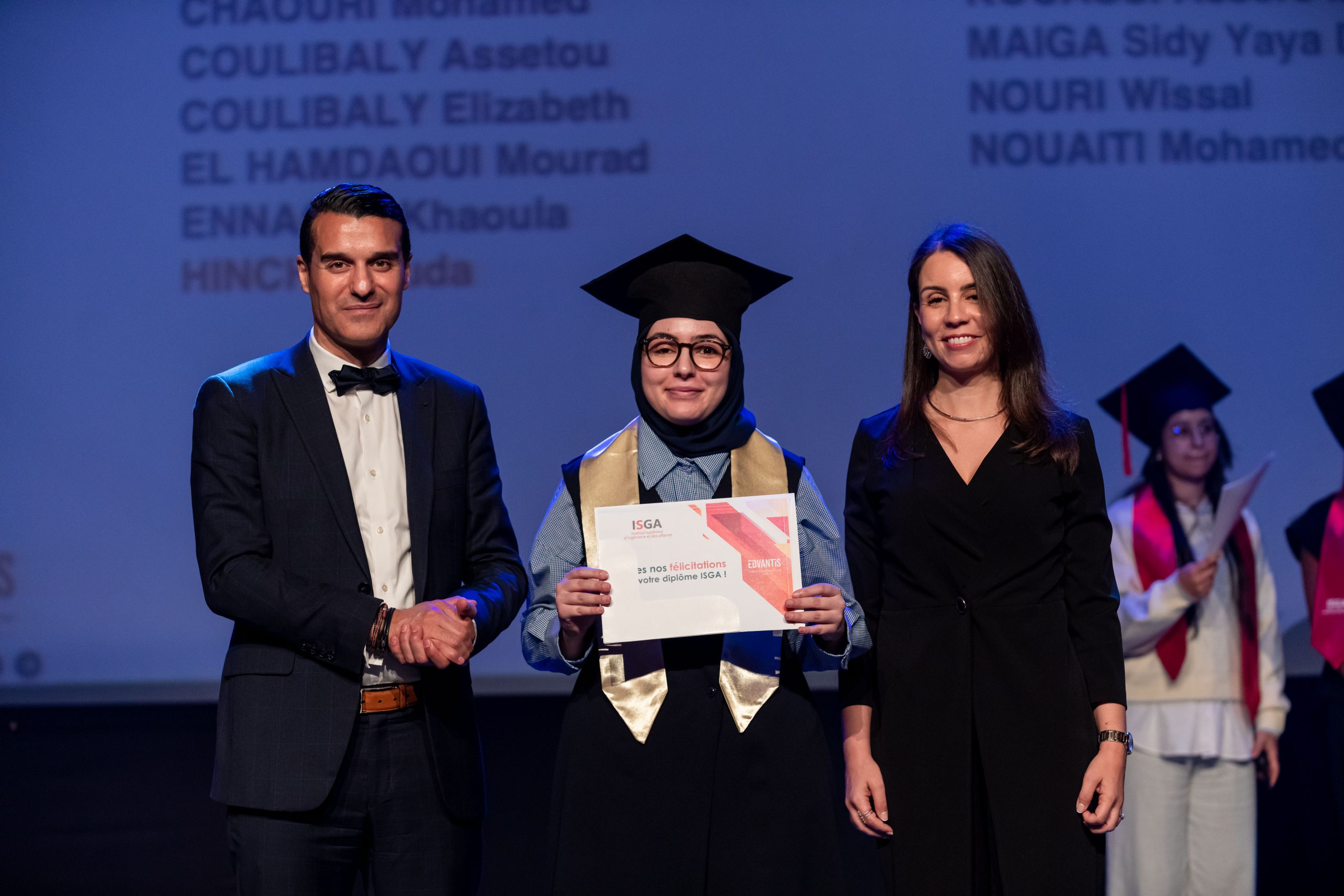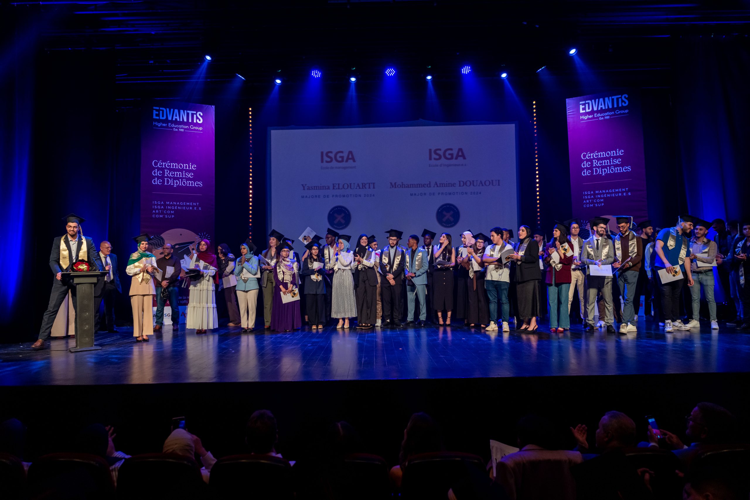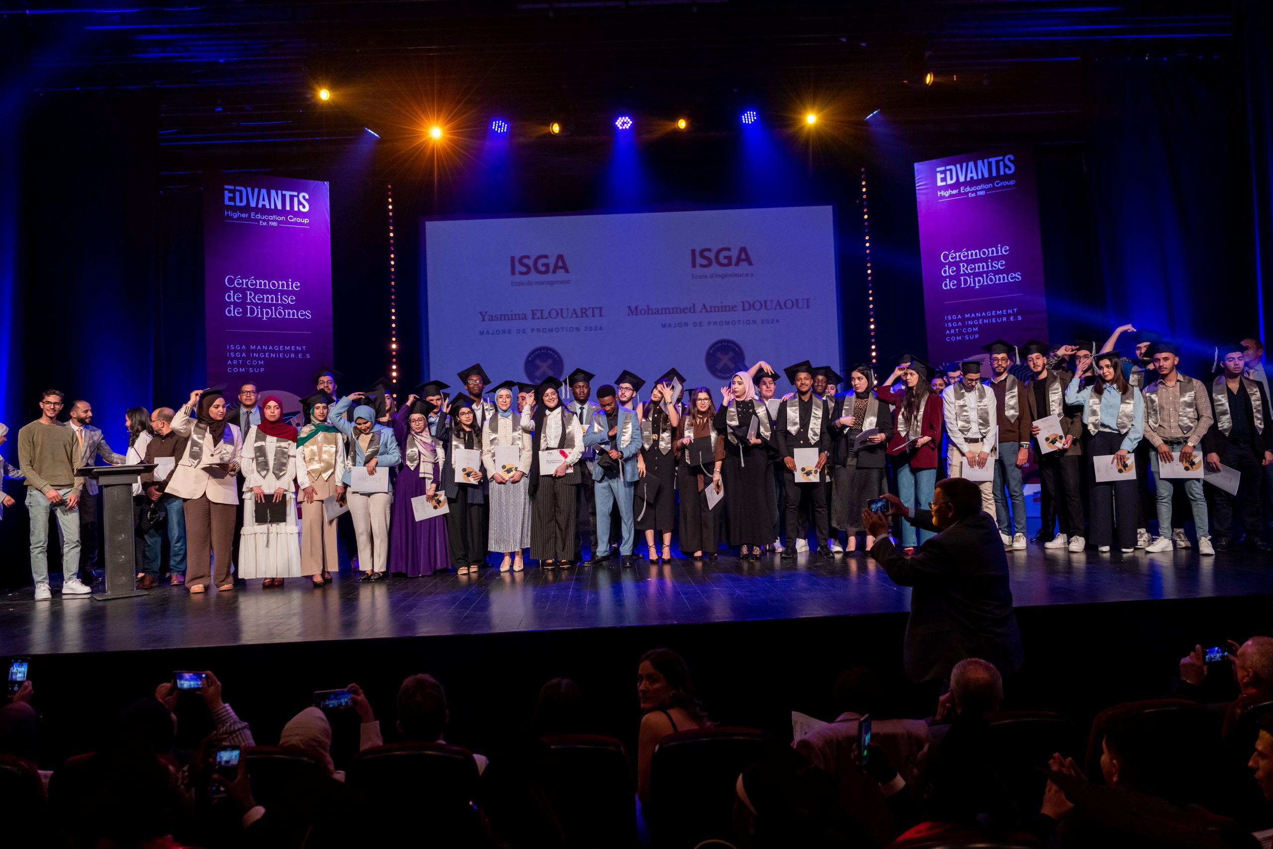 La cérémonie, animée par Layla Medkouri, directrice du campus Art’Com Casablanca, et Allal Alain Difafi, directeur de l’école de Management – ISGA Rabat, a réuni une foule enthousiaste. Le parrain de la promotion 2024, Youssef Cheikhi, Président du Gam, le Dr. Tawhid CHTIOUI, Président du Groupe Edvantis, ainsi que toutes les équipes pédagogiques et administratives étaient présents pour partager ce moment de joie avec les lauréats.