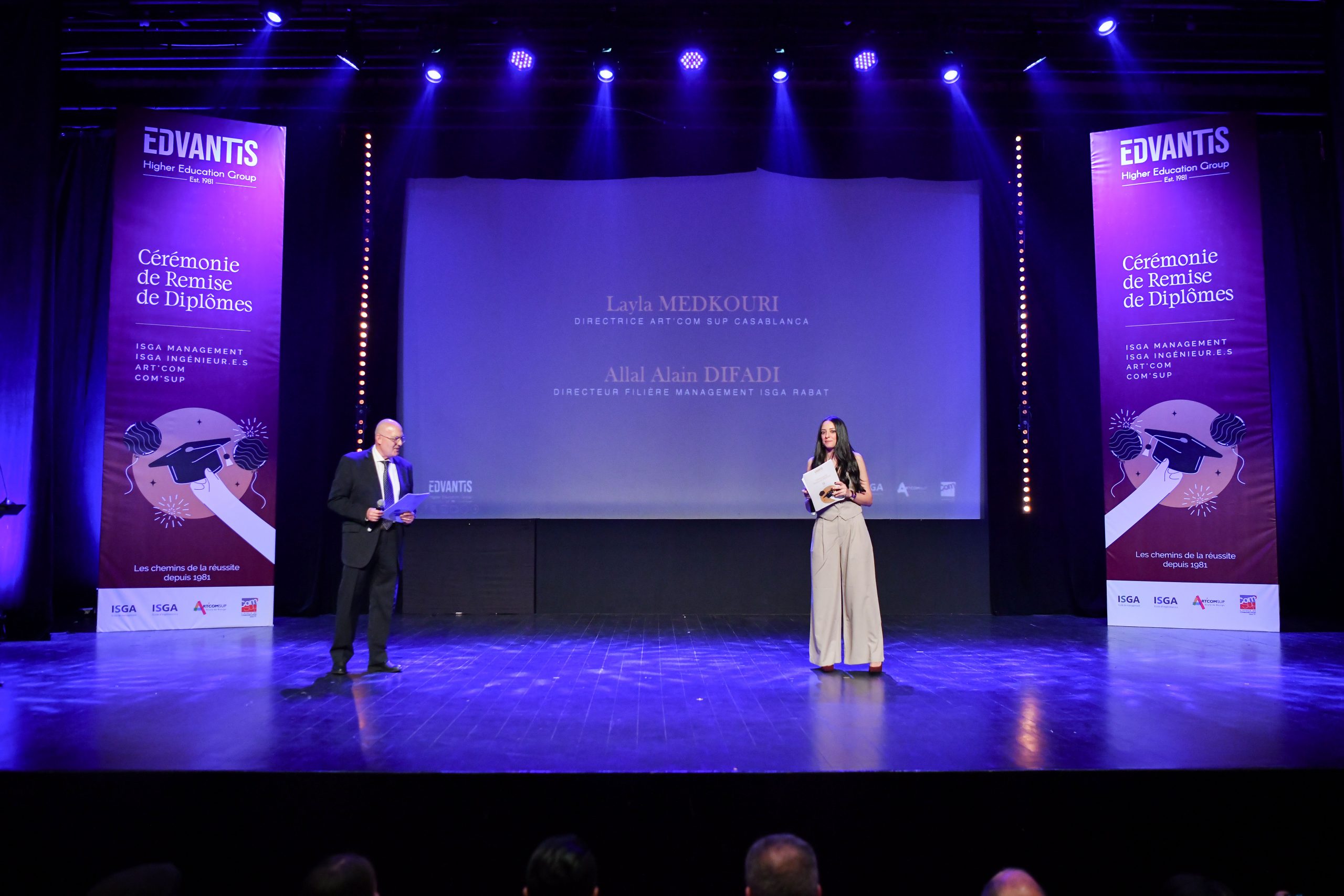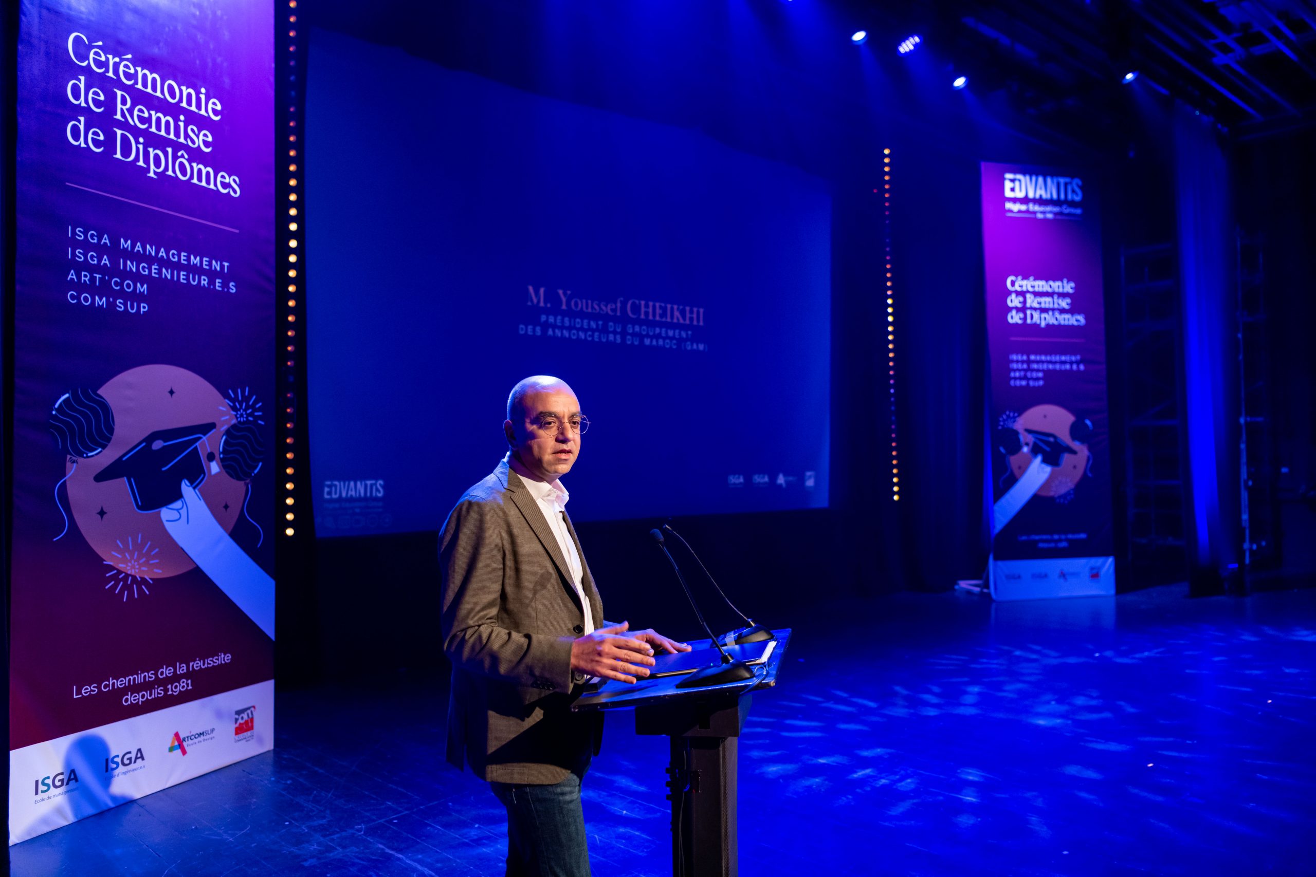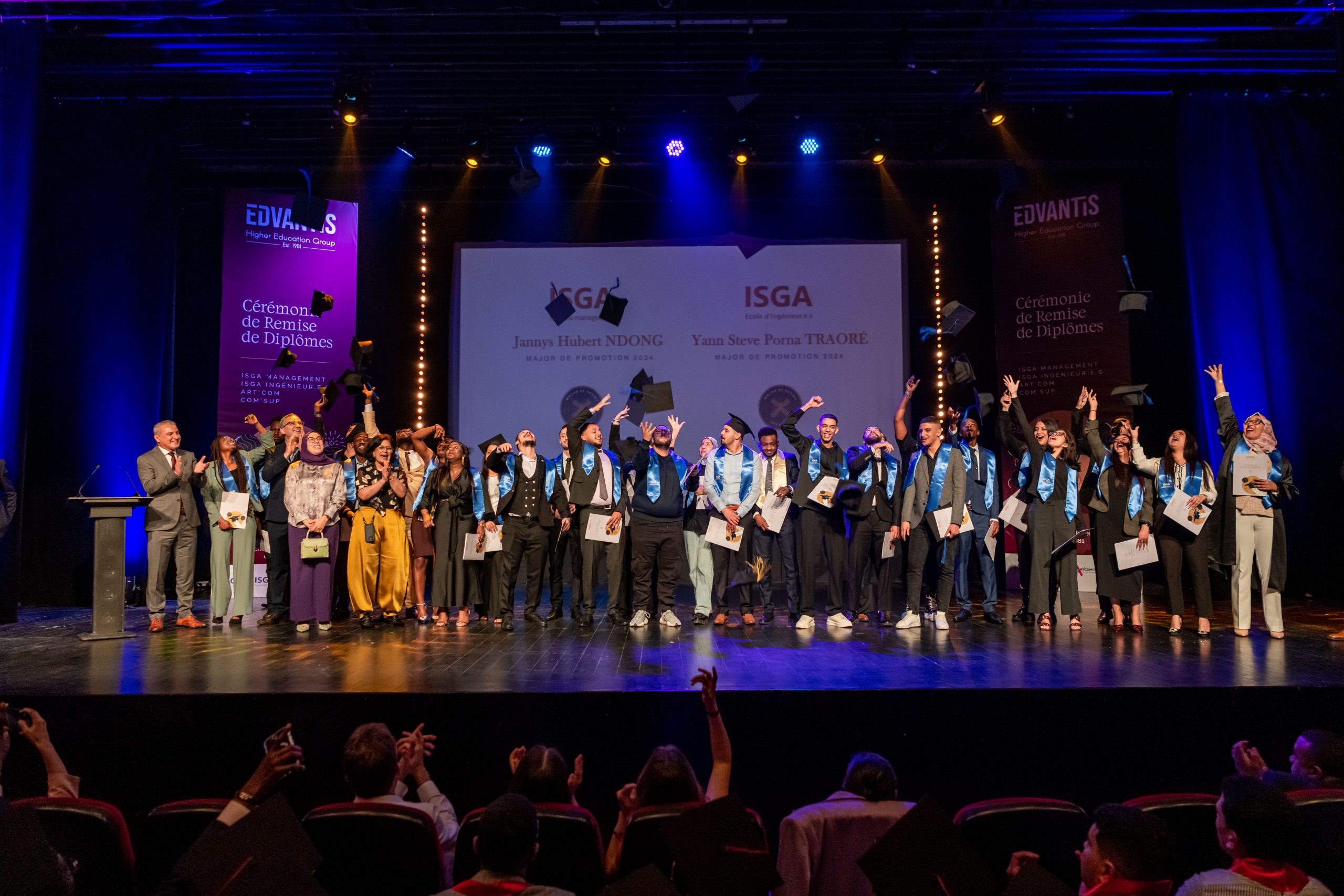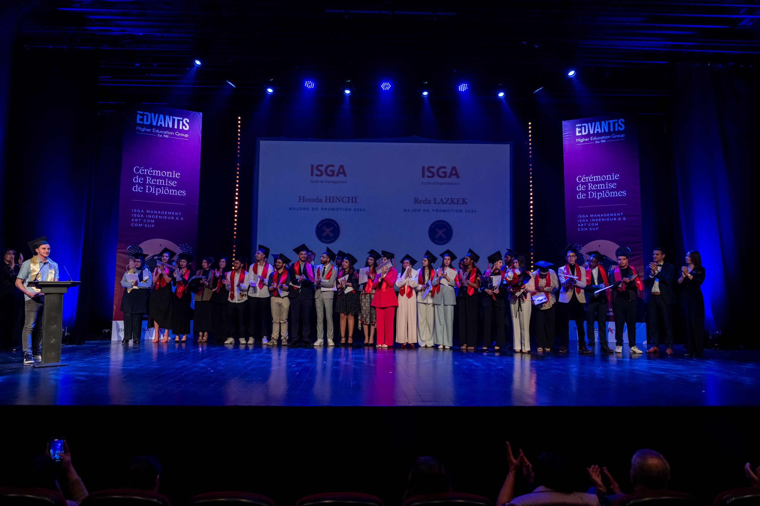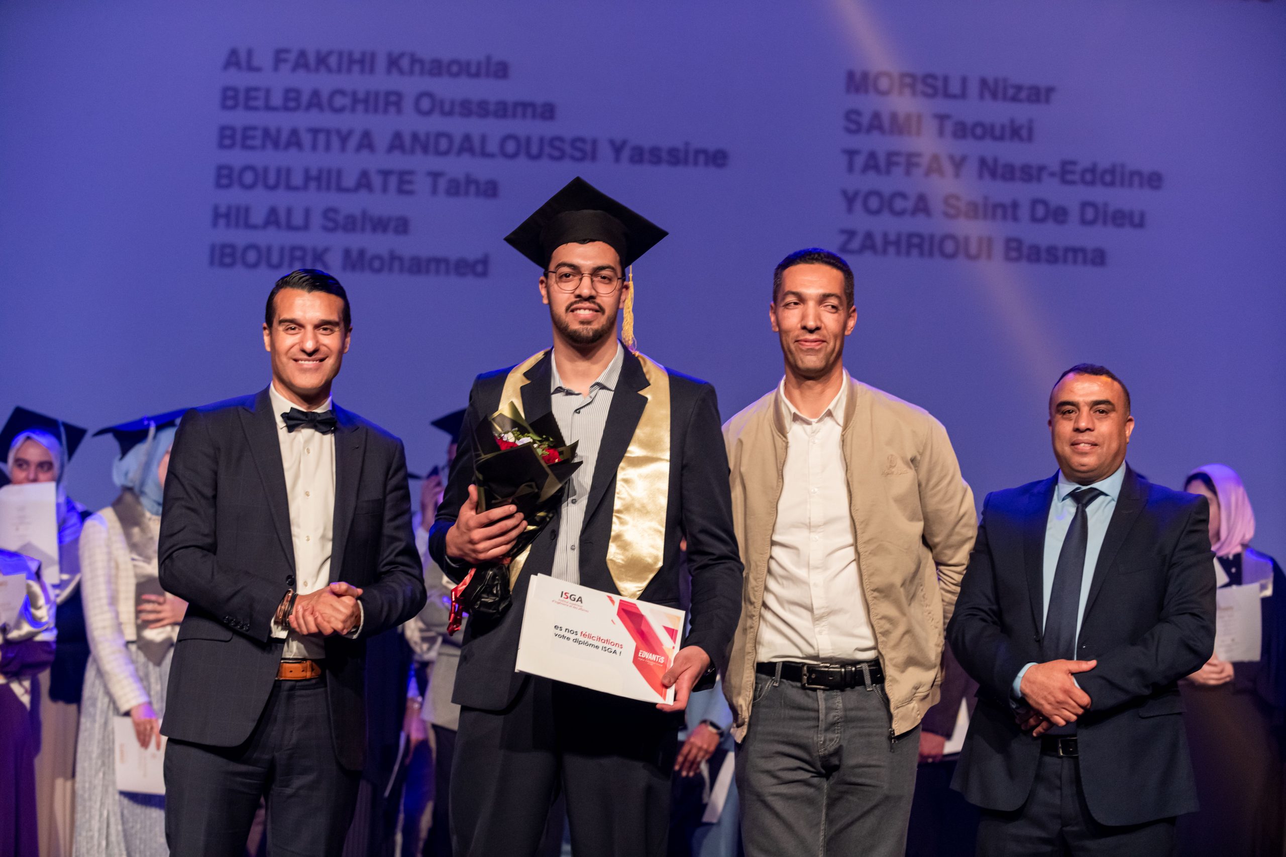 La cérémonie, animée par Layla Medkouri, directrice du campus Art’Com Casablanca, et Allal Alain Difafi, directeur de l’école de Management – ISGA Rabat, a réuni une foule enthousiaste. Le parrain de la promotion 2024, Youssef Cheikhi, Président du Gam, le Dr. Tawhid CHTIOUI, Président du Groupe Edvantis, ainsi que toutes les équipes pédagogiques et administratives étaient présents pour partager ce moment de joie avec les lauréats.