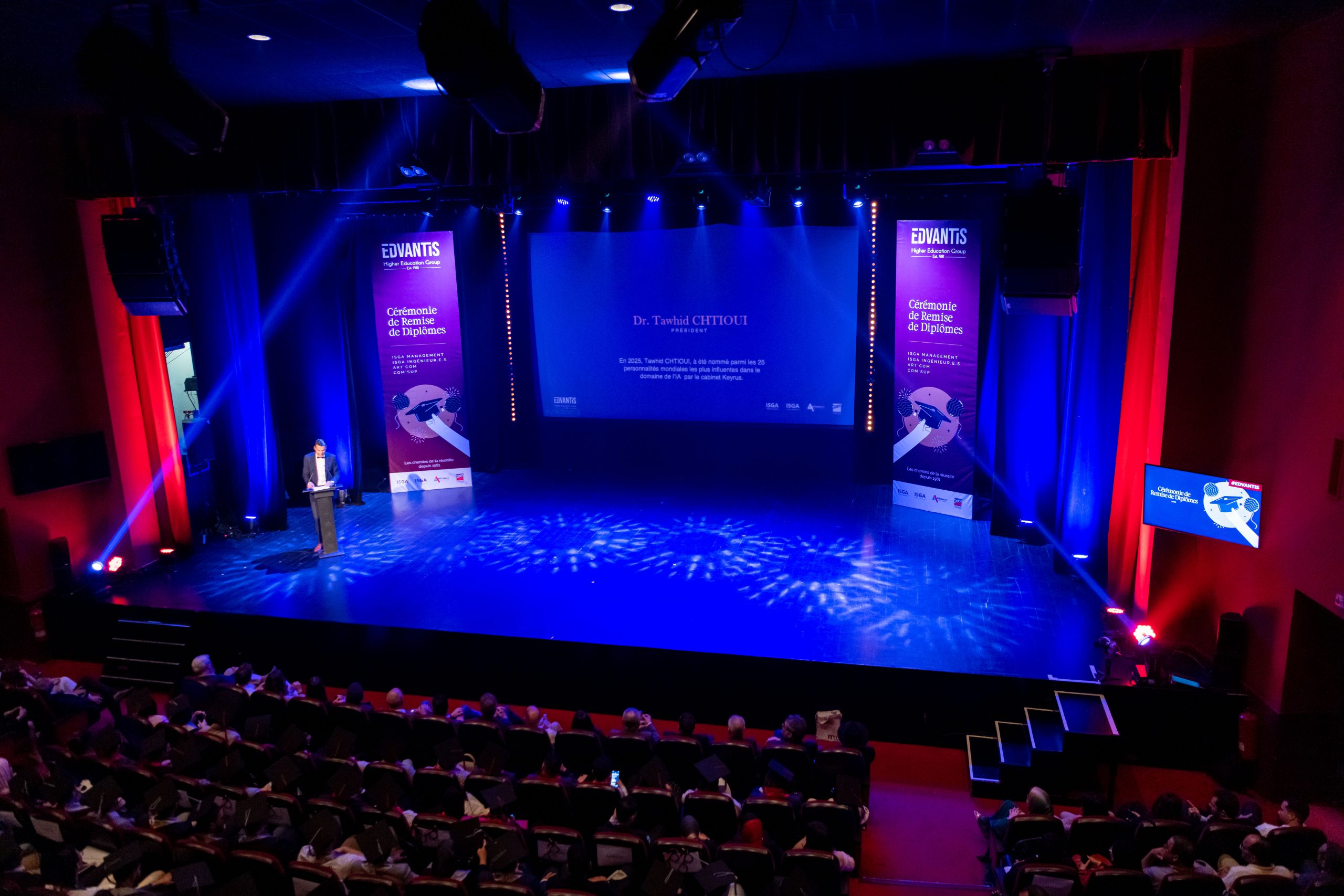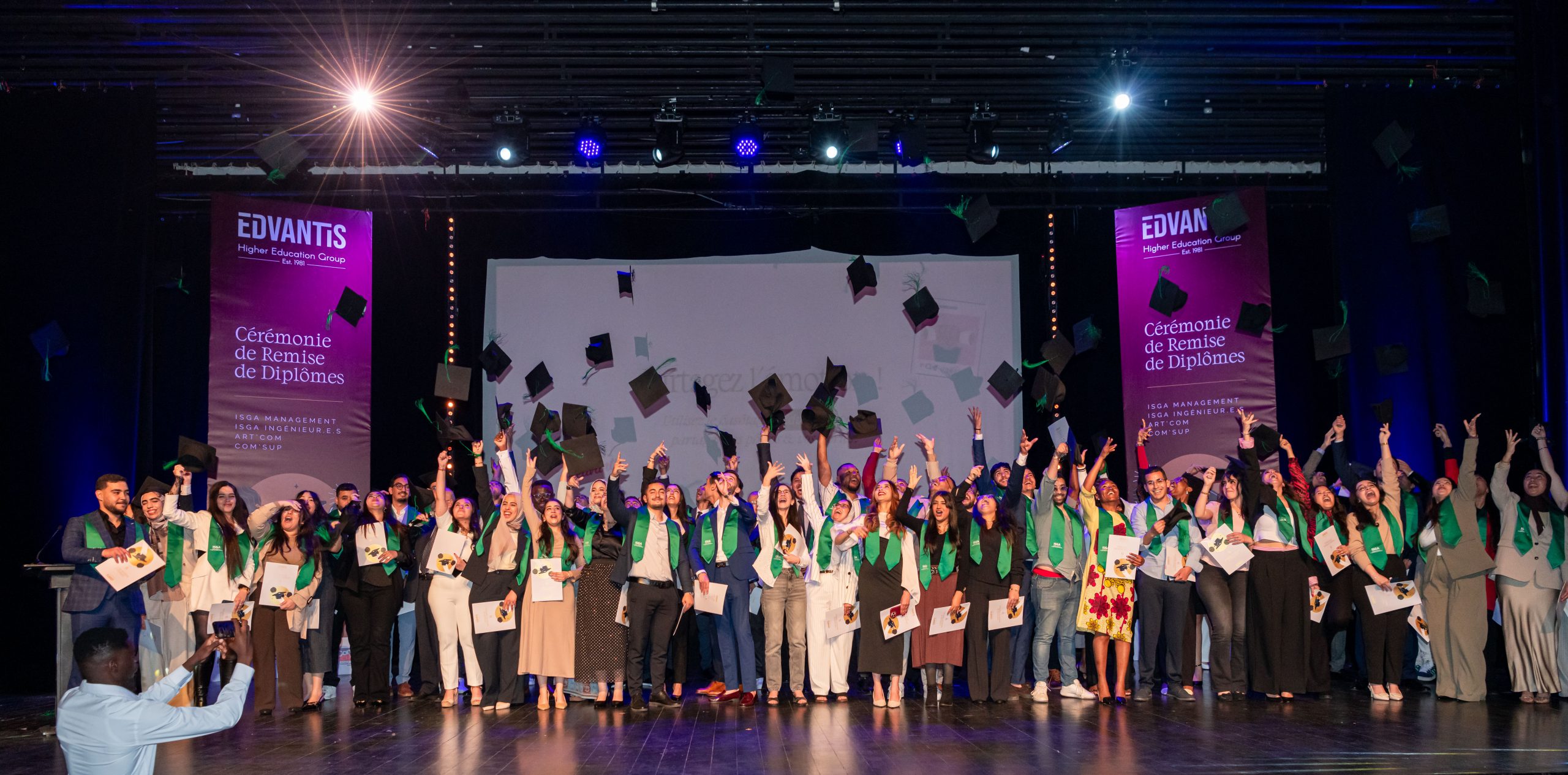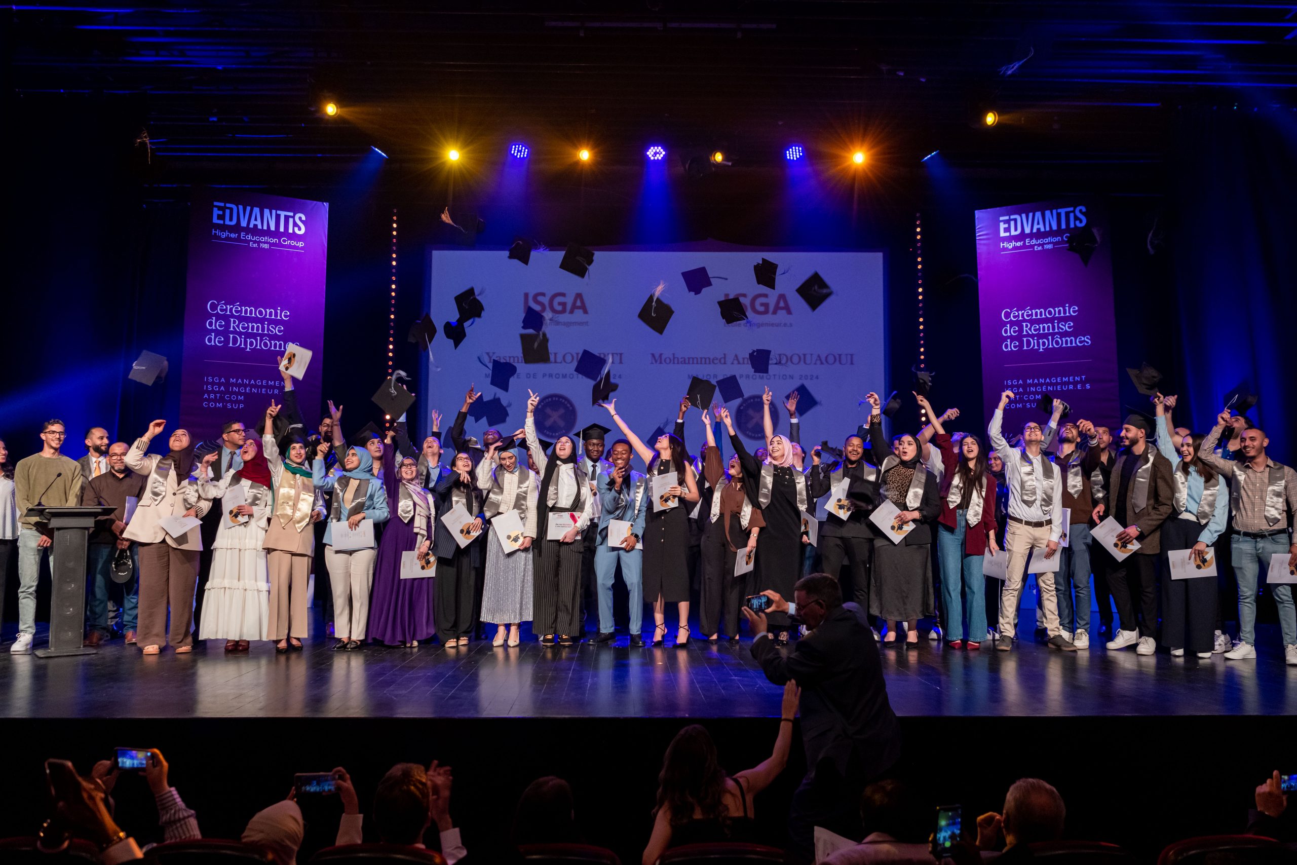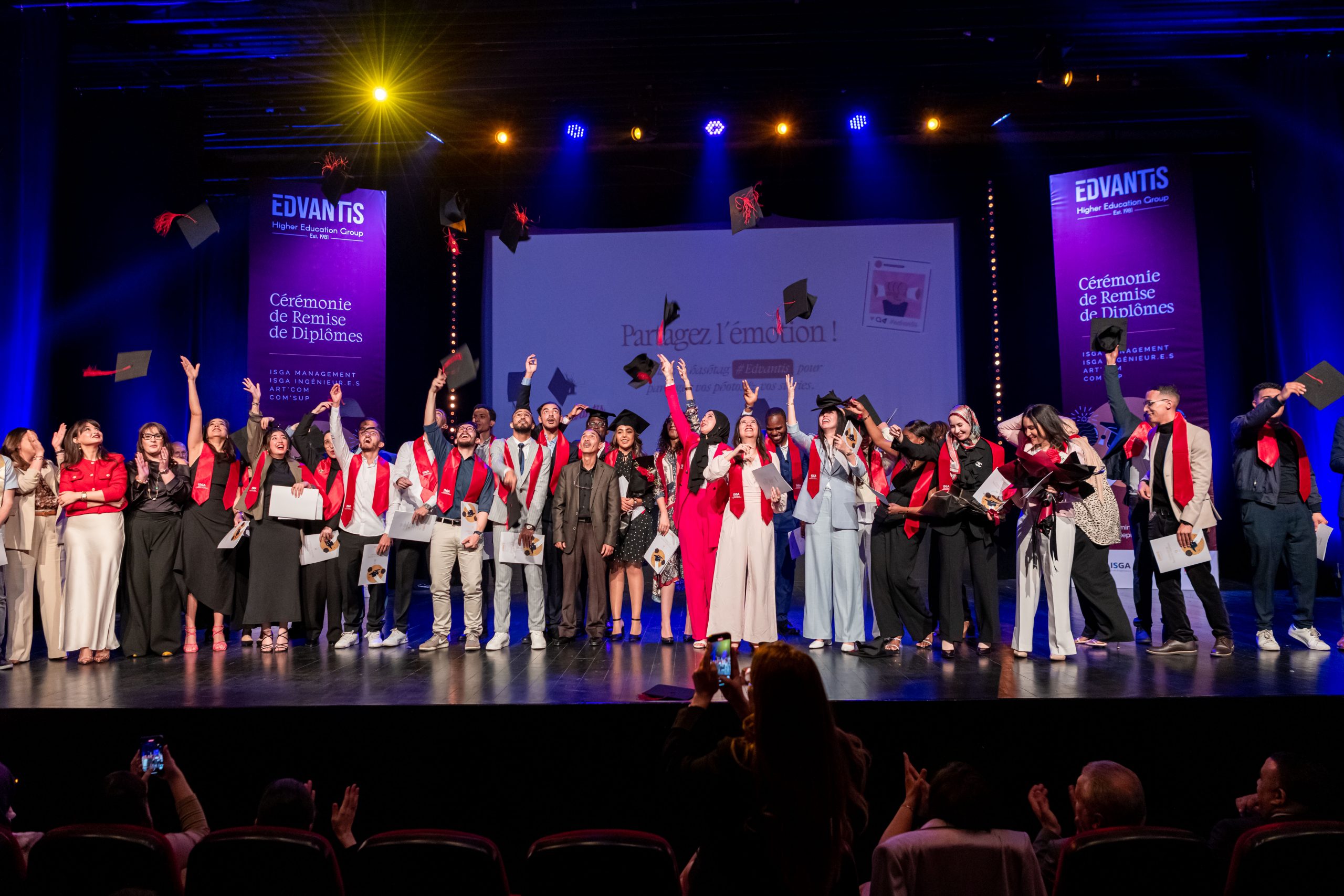 Samedi 12 avril 2025, les 350 diplômés des écoles du Groupe Edvantis – ISGA, Art’Com Sup, et Com’Sup – ont vécu un moment inoubliable, célébré au Studio des Arts Vivants à Casablanca. Entourés de leurs familles, enseignants, encadrants et amis, ils ont marqué la fin d’un parcours et l’ouverture d’un nouveau chapitre.
