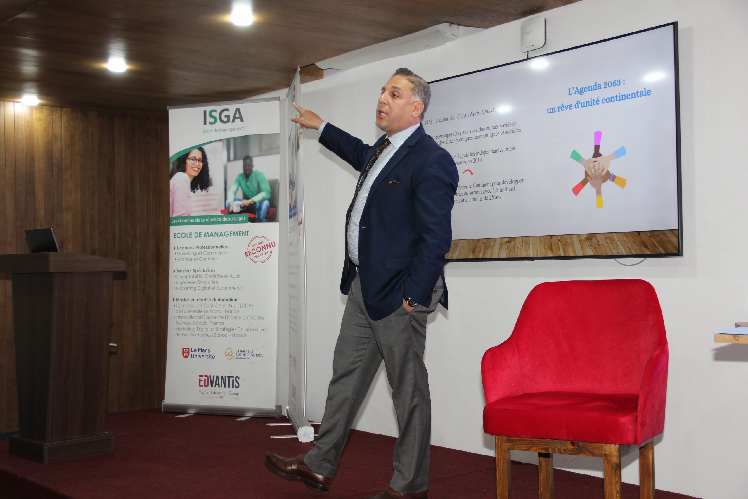 La conférence « Maroc et ZLECAF : Défis et Perspectives d’un Projet Ambitieux« , animée par Reda NOUR, président fondateur du Centre Marocain des Études Africaines et du Développement Durable, s’est tenue à l’ISGA campus Fès en faveur de nos étudiants et des professionnels.